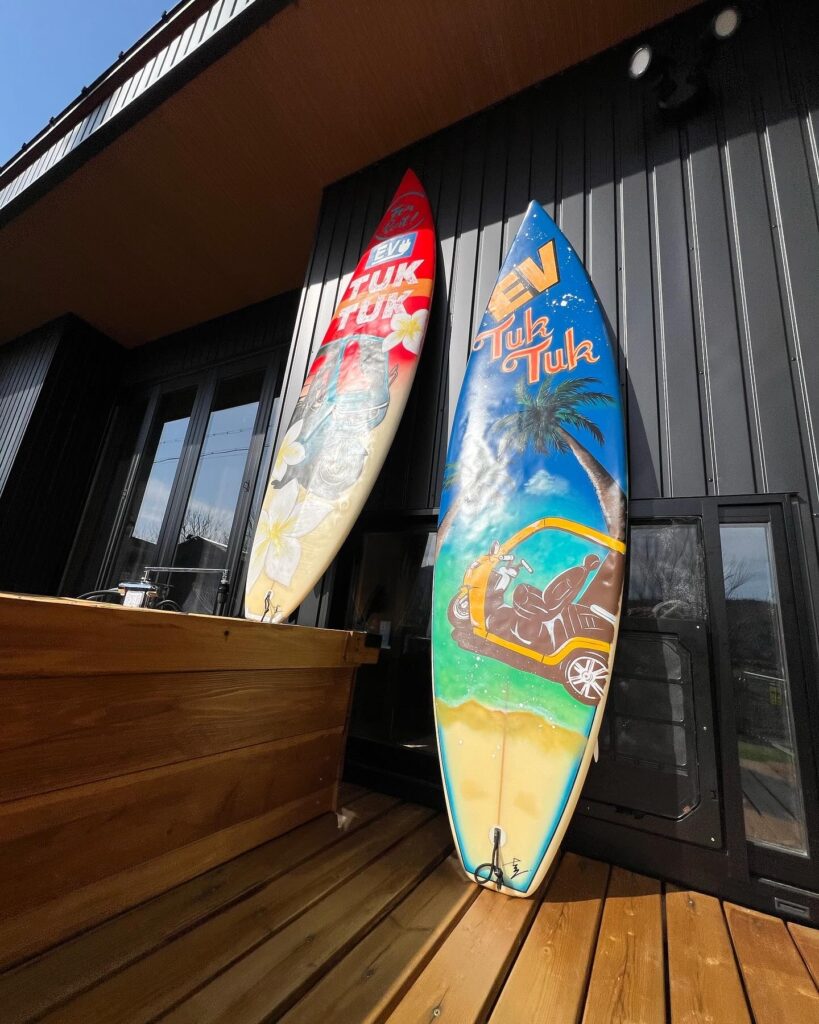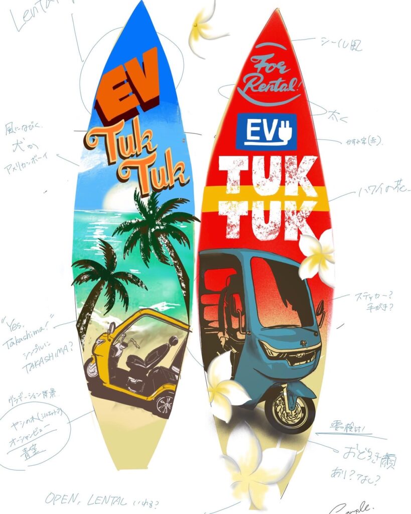サーフボードをお持ち込みいただき、ワックスを落としてヤスリがけした後に下地を塗りペイントさせていただきました。 アメリカン?ハワイアン?な印象とEVトゥクトゥクを掛け合わせました。クリア塗装もしているので劣化にも強い仕上がりになりました。 お使いいただくうちに傷が増えてもっとヴィンテージ感が出ることでしょう♪